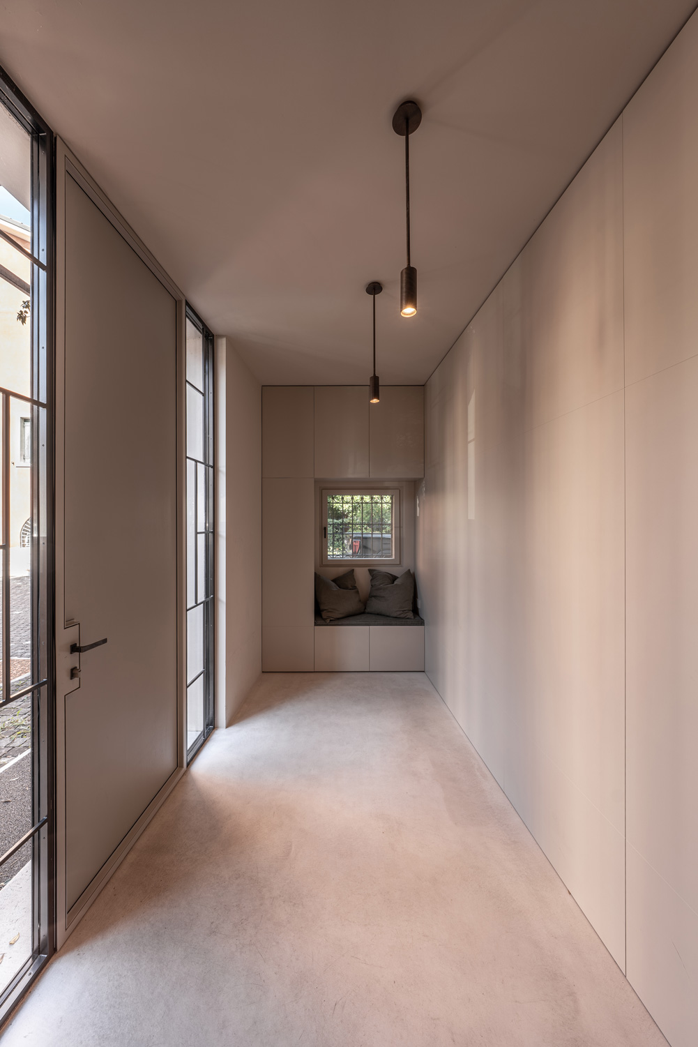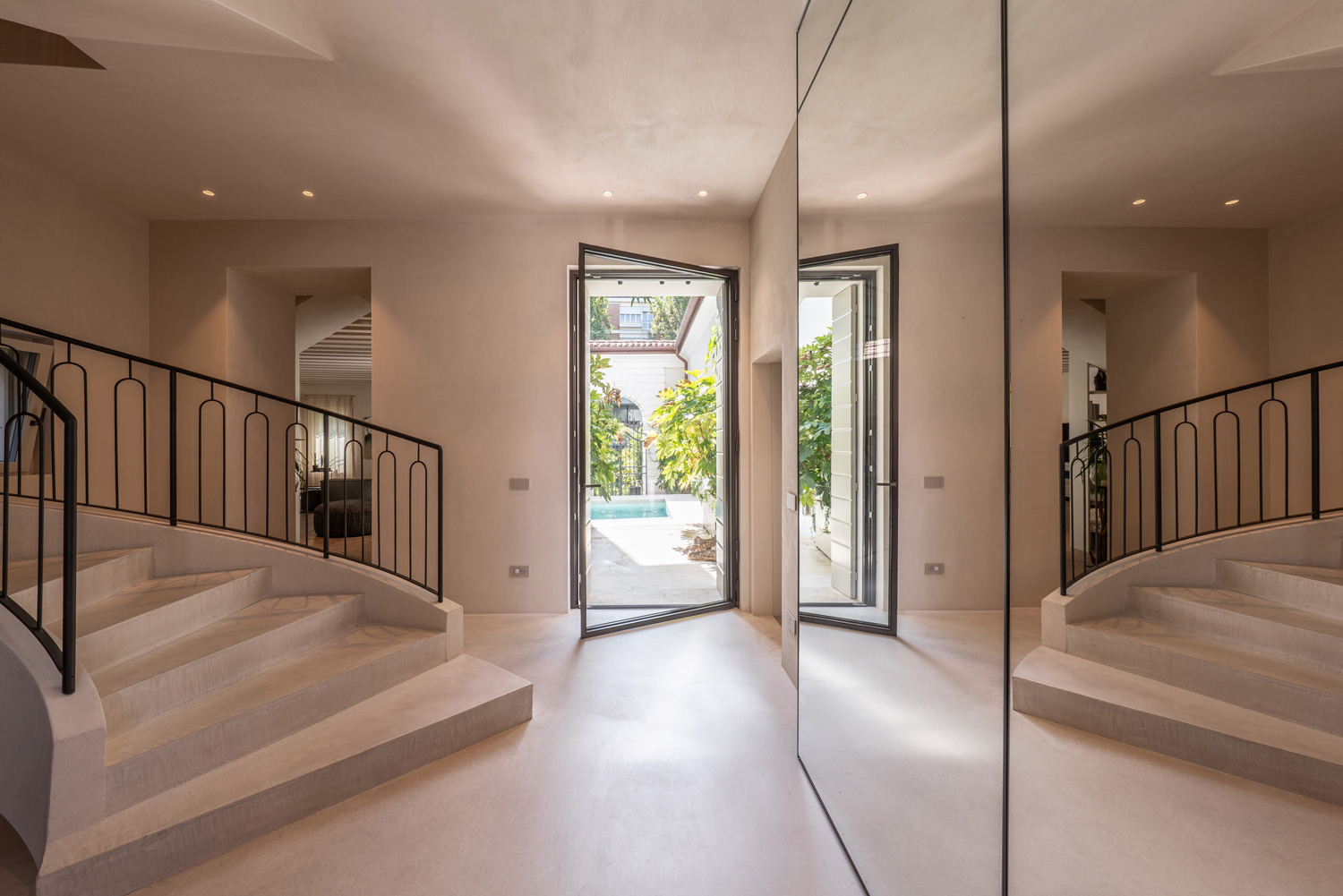 Binnenin is het gebouw onderverdeeld in drie wooneenheden rondom een centraal punt: de binnenplaats, opgezet als een kleine geheime tuin met een zwembad, omgeven en beschermd door het groen van de bomen. De trap verbindt de verdiepingen op een vloeiende manier, biedt steeds weer veranderende perspectieven en voert mee in een flow die het gebouw als één samenhangend geheel laat ervaren. Het interieur volgt de algemene opzet: de kamers vloeien in elkaar over, zijn open, licht en luchtig; slechts een paar elementen, die met elkaar in verbinding staan en die zich gracieus invoegen in het geheel. De kleuren zijn ingetogen, licht en neutraal, zodat ze het licht beter kunnen opvangen en in de ruimte kunnen verspreiden. De keuken, die gemaakt is van hout en metaal, is het middelpunt en verleent het totaalbeeld een verfijnde industriële touch.