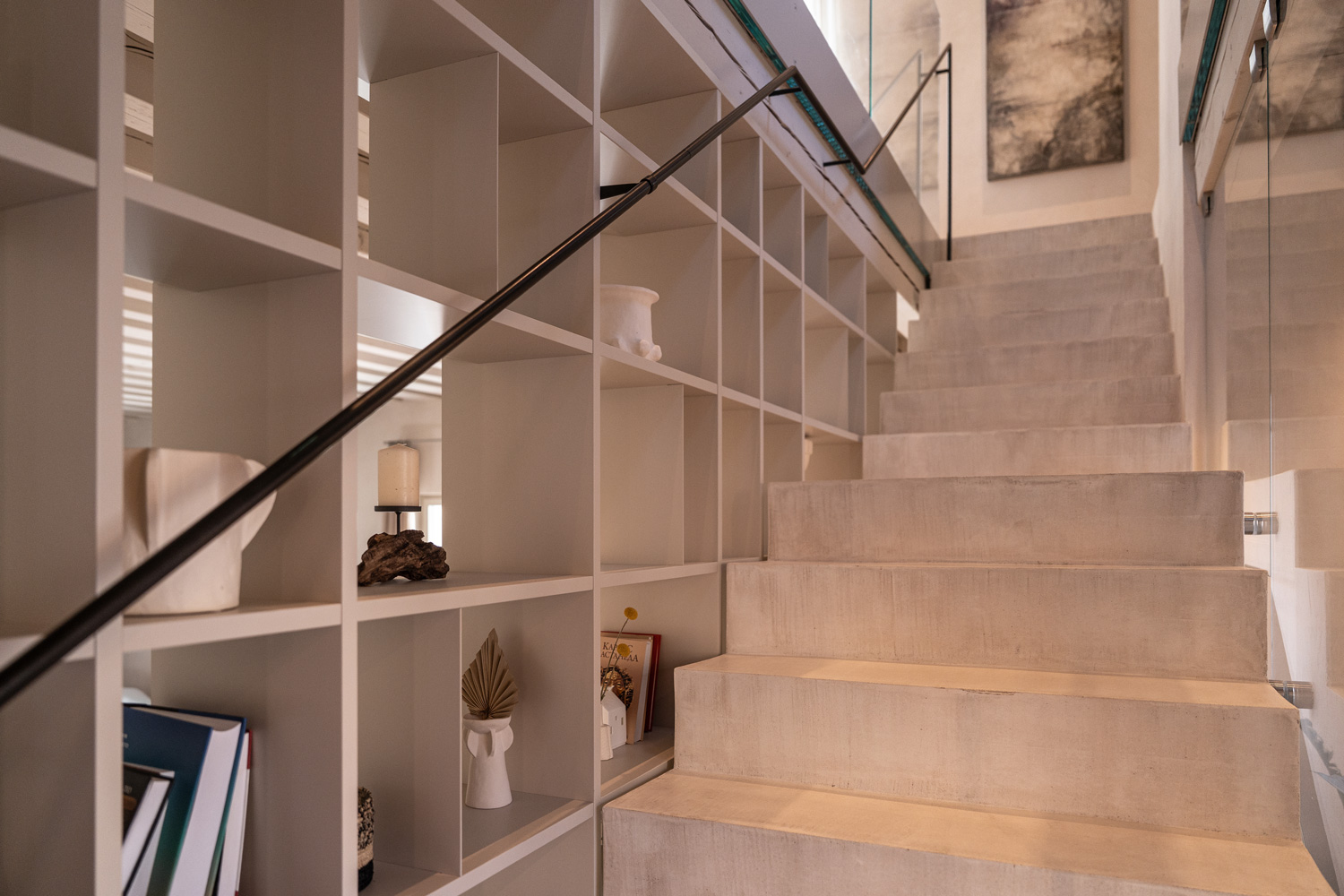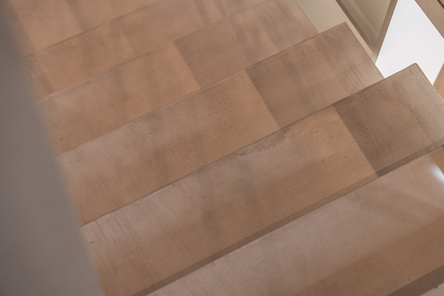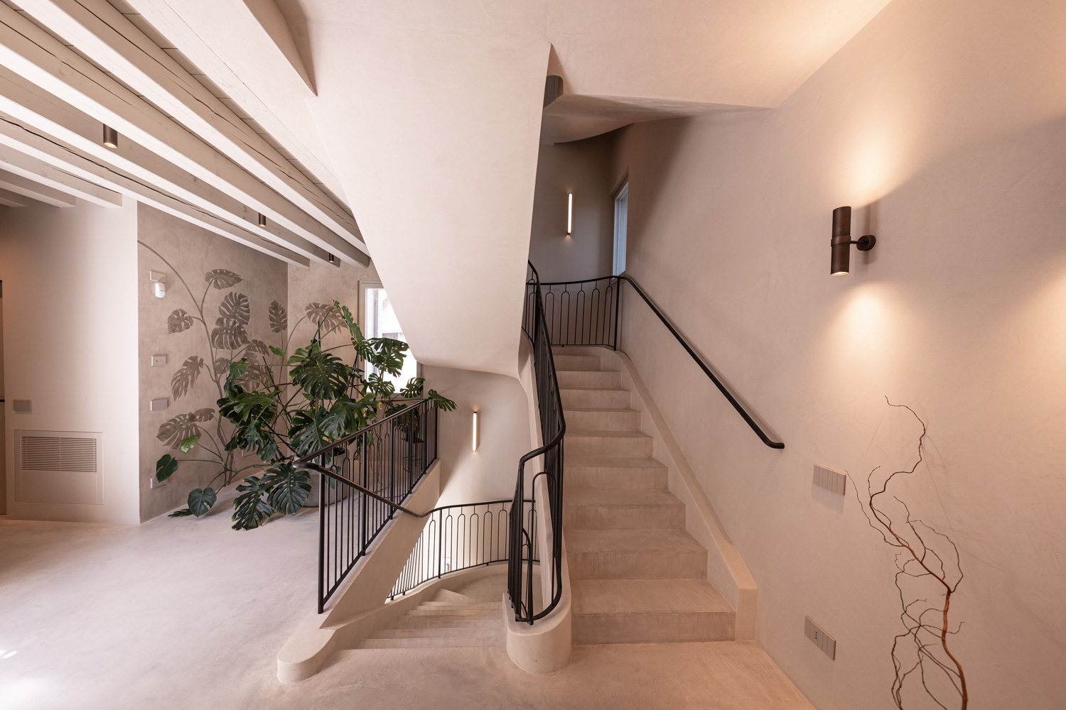 Om de verschillende wooneenheden met elkaar te verenigen, is voor de vloeren en de centrale trap gekozen voor Nuvolato Architop®, de cementgebonden oplossing van Ideal Work met industriële charme. Dit materiaal behoudt met slechts enkele millimeters (3-4 mm) de robuuste karaktervolle uitstraling van beton, maar zorgt tegelijkertijd voor meer esthetische finesse en verfijning. Bij Palazzo Tezzone is dit materiaal toegepast om een pittig en eigentijds effect te geven, terwijl het tegelijkertijd een neutraliteit behoudt die perfect samengaat met de historische elementen van de woning. Dit materiaal is bovendien ideaal voor renovaties, omdat hiermee zowel binnen- als buitenvloeren vernieuwd kunnen worden zonder dat ze verwijderd hoeven te worden, zelfs bij vloerverwarming.