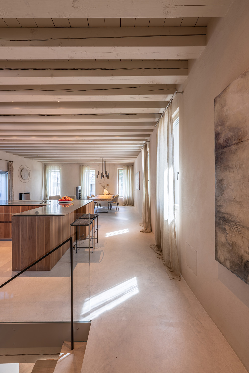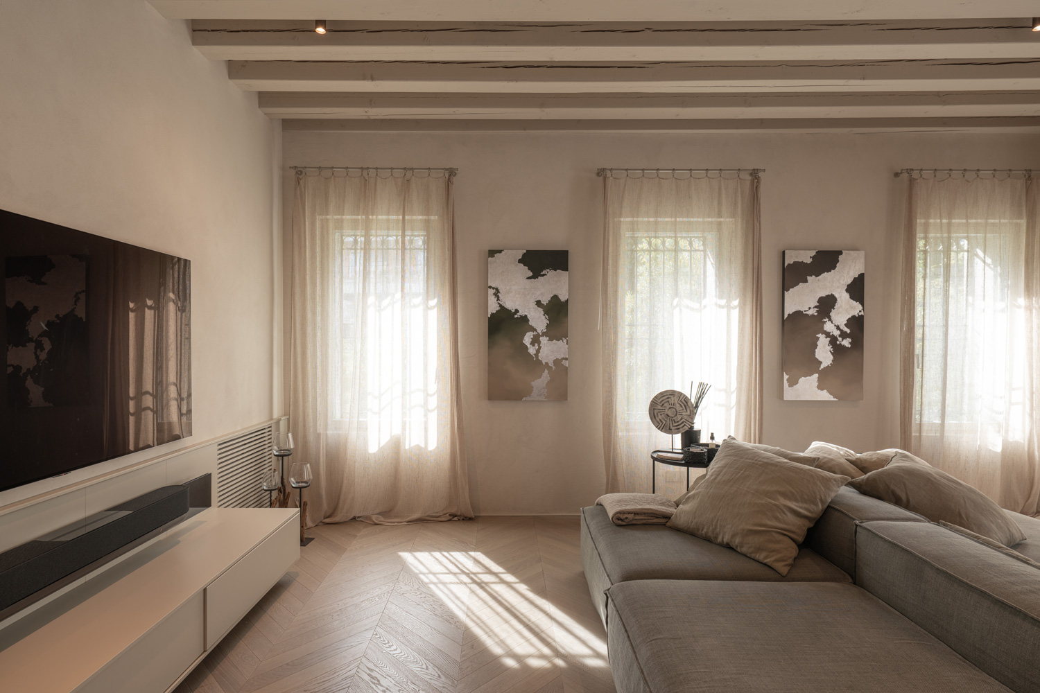 Licht, ruimtelijke continuïteit en dialoog met het landschap hebben geleid tot een transformatie van Palazzo Tezzone, die zowel respectvol als uitgesproken van karakter is en die bedacht is door het bureau MMP Studio in Treviso. Essentiële materialen en neutrale tinten zijn gecombineerd met de continuïteit van Nuvolato Architop®, wat bijdraagt aan een vloeiende overgang van de ruimtes.