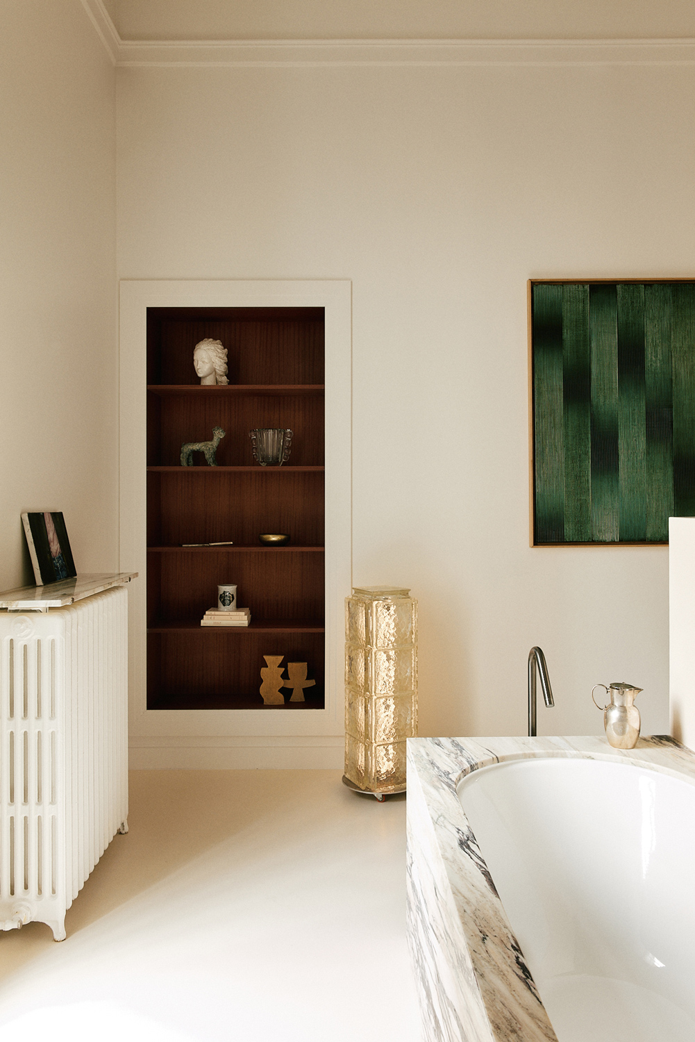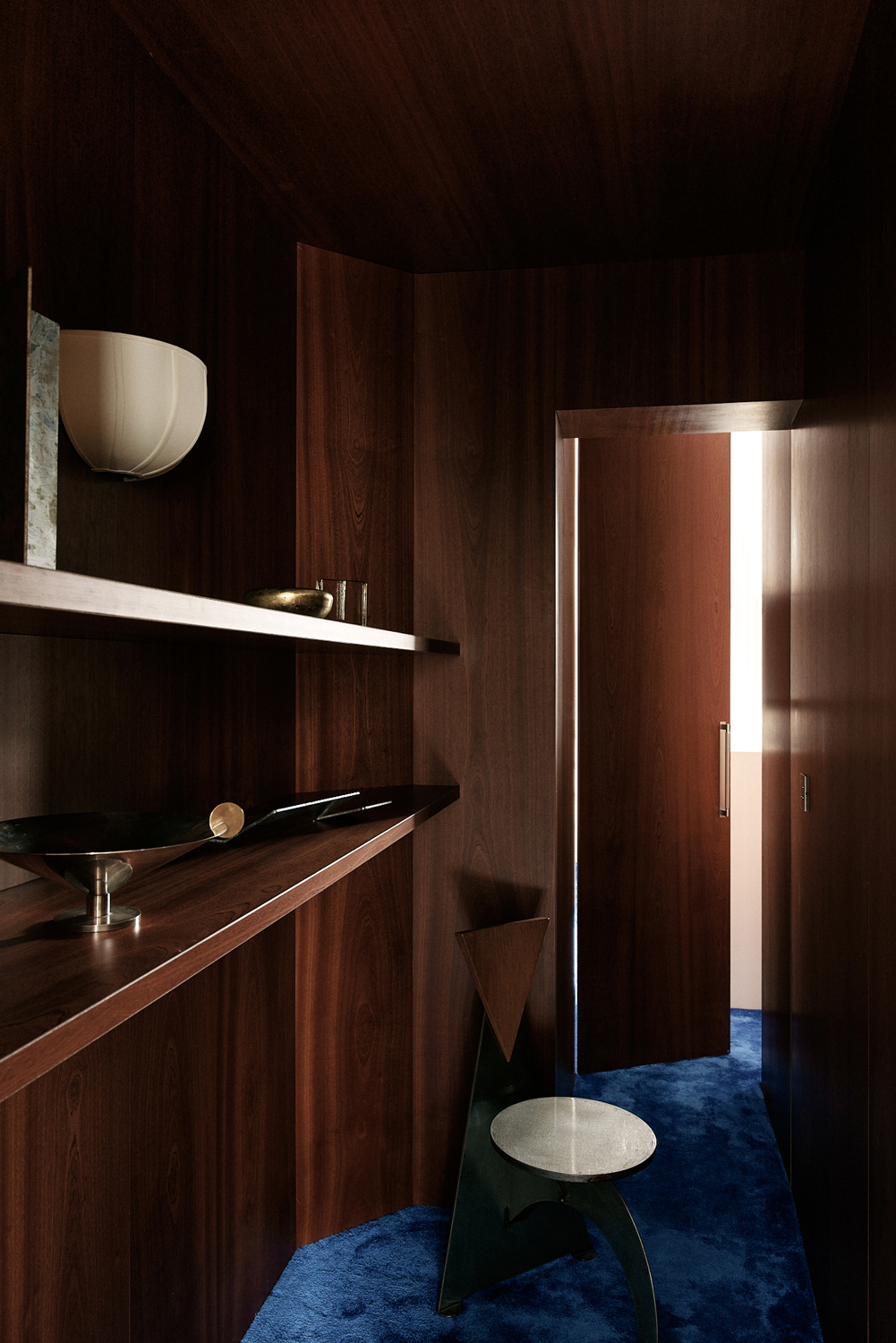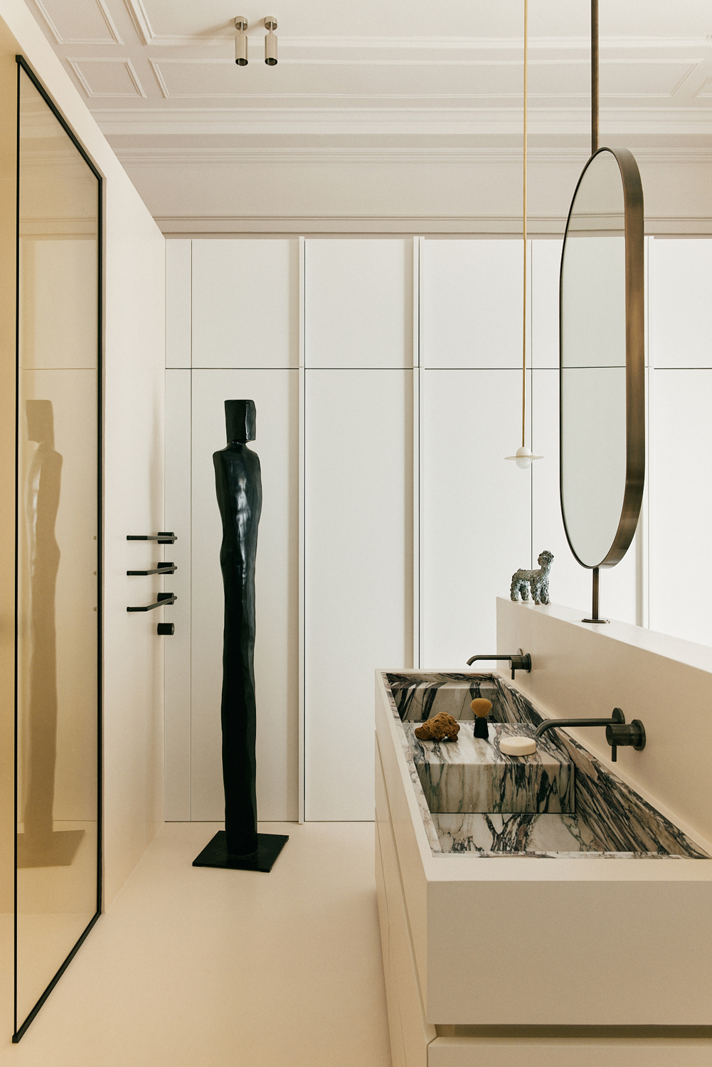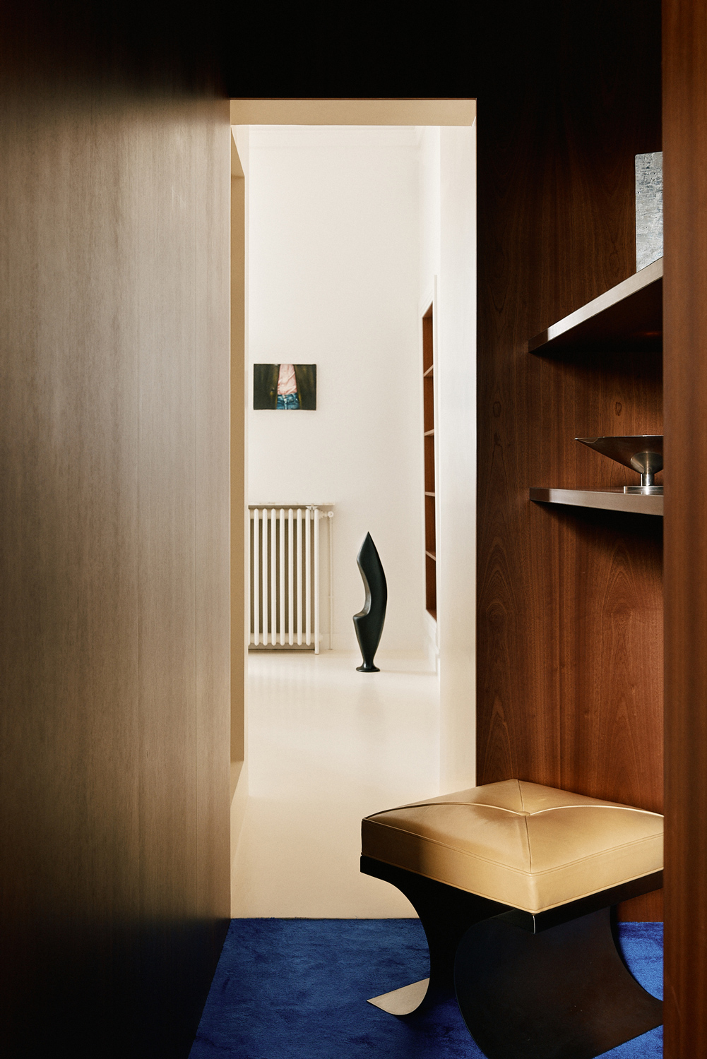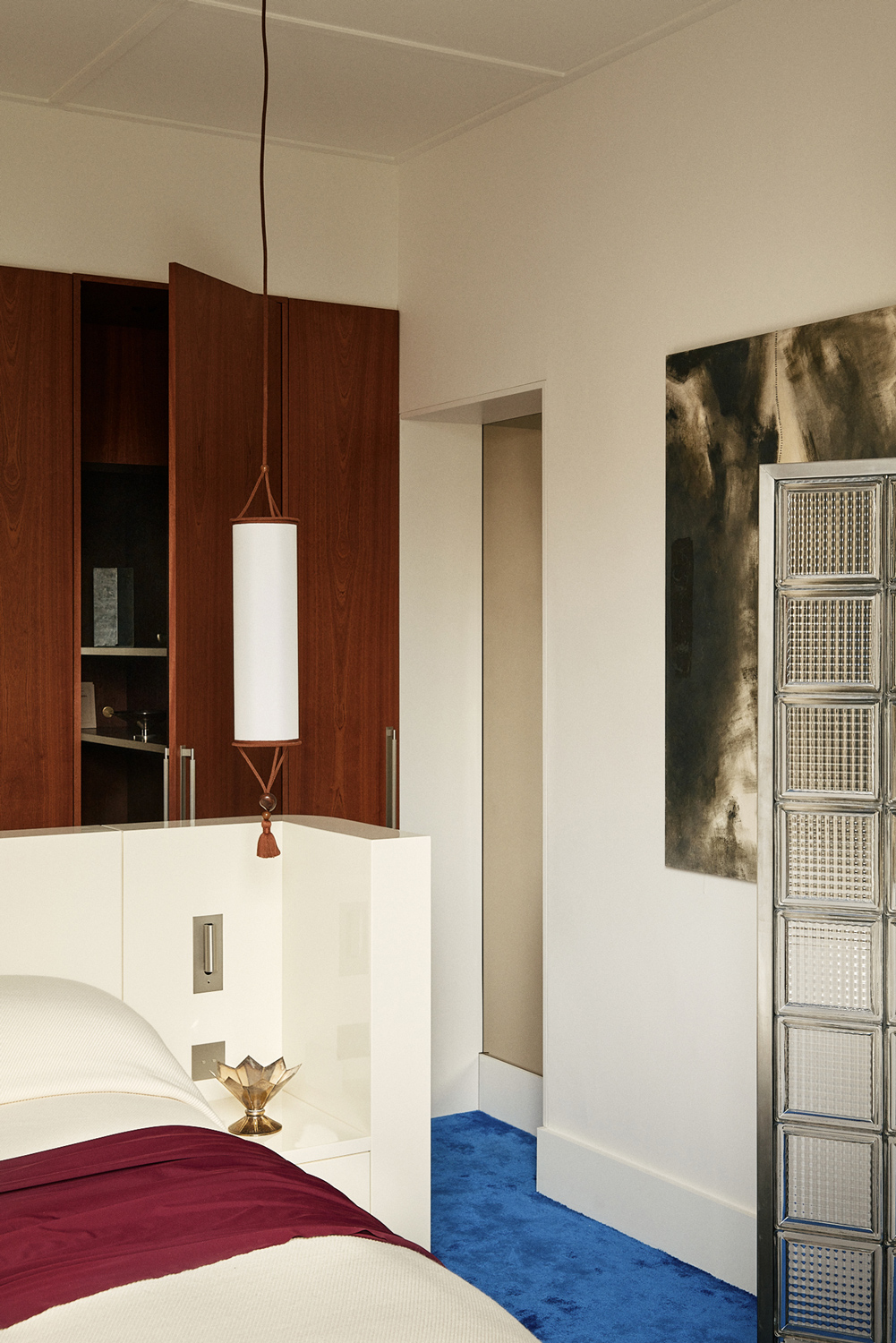 Het slaapgedeelte daarentegen wordt opgevat als een intieme en sfeervolle toevluchtsoord. Sapelli-hout omhult de ruimte met een exotische warmte, aangevuld met hanglampen van ruwe zijde. Een verborgen doorgang leidt naar een lichte badkamer, waar marmer en Microtopping® in een sobere en elegante dialoog samenkomen.