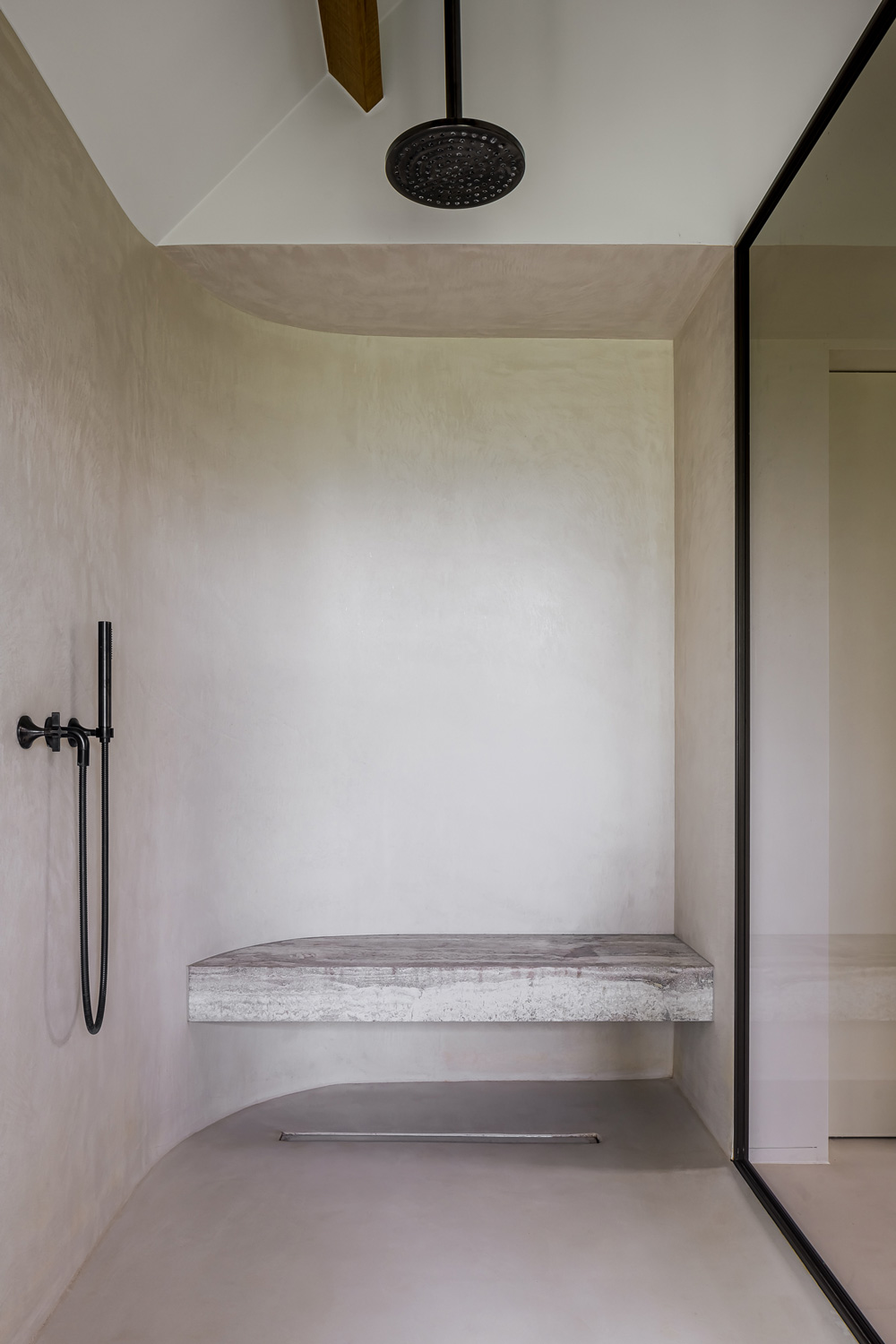 In de badkamer is Microtopping® toegepast op vloeren, wanden en zelfs op de rondlopende, gebogen douchecabine. De strakke lijnen van het materiaal worden verzacht door de vloeiende vormen, waardoor een zintuiglijke beleving van ontspanning en rust ontstaat. De combinatie met natuursteen, waarmee de wastafel, het douchebankje en de decoratieve elementen van het bad zijn gerealiseerd, creëert een aangenaam visueel en tastbaar contrast tussen de verschillende texturen en verleent de badkamer een perfecte, hedendaagse elegantie.