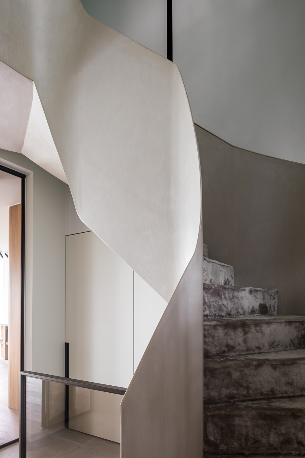 Continuïteit vormt hier één van de kernpunten en daarom is de stille hoofdrolspeler in elke ruimte steeds weer Microtopping®: de innovatieve oplossing van Ideal Work met bijzonder veelzijdige toepassingsmogelijkheden, waarmee elk oppervlak, horizontaal én verticaal, met een dikte van slechts 3 mm naadloos afgewerkt kan worden. Bij binnenkomst springt meteen de als een beeldhouwwerk vormgegeven trap in het oog, die afgewerkt is met Microtopping®, dat meebeweegt met elke kromming en lijn, zonder ook maar één onderbreking. In een vloeiende, zachte beweging van beneden naar boven is de trap zo omgevormd tot een indrukwekkend statement. Ook de zitbank in de woonkamer is afgewerkt met Microtopping®, waardoor een elegante blikvanger is ontstaan en de ruimte is verrijkt met een comfortabel en stijlvol zitje. Terwijl de vloer hier in hout is uitgevoerd, zorgt Microtopping® in de keuken en eetkamer voor een zachte, vloeiende verbinding tussen de ruimtes en laat de vormgeving van de haard in het midden prachtig tot zijn recht komen. De essentiële en rechtlijnige keuken voegt zich subtiel in het geheel dankzij de donkere meubels met strakke lijnen en het lichtkleurige stenen aanrechtblad. Het ontbreken van overbodige elementen benadrukt de kwaliteit van de materialen en de precisie van elk constructiedetail.